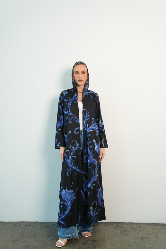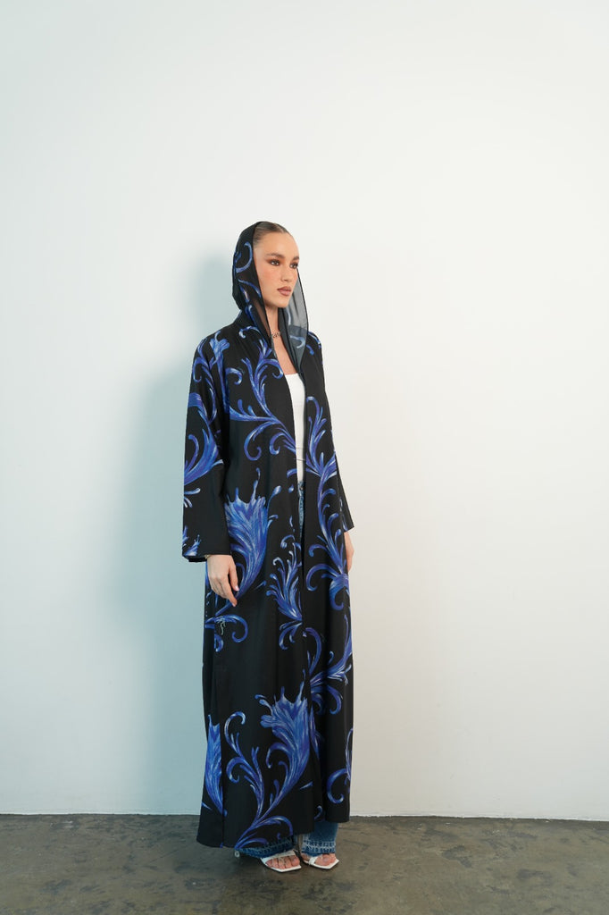 purple printed fabric abaya, comes with matching one side printed sheila.