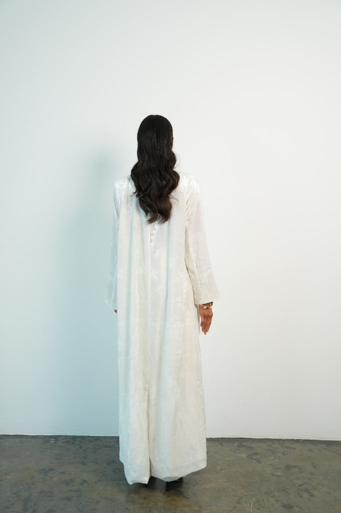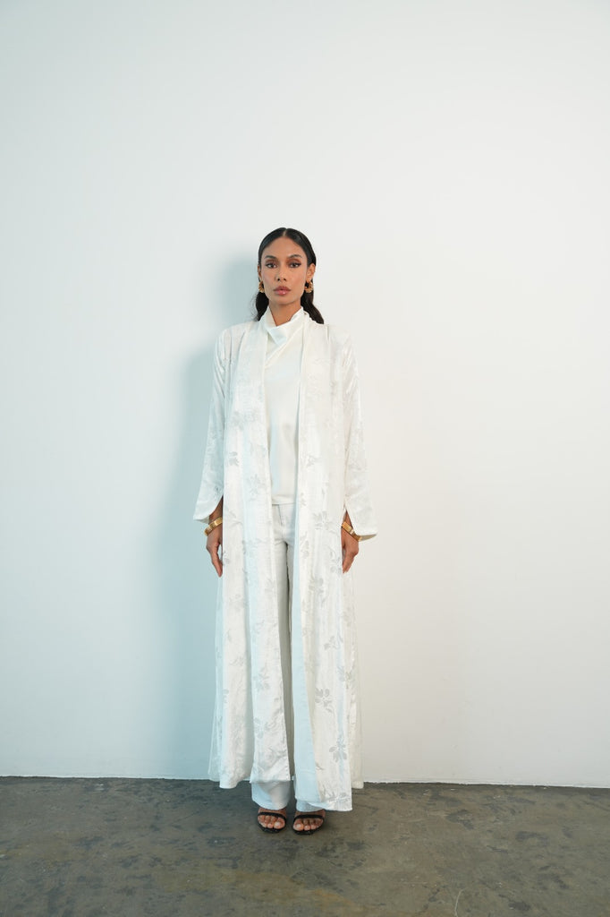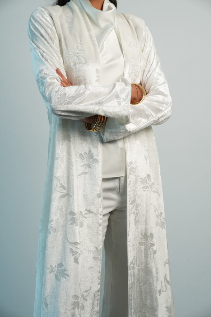 velvet fabric white abaya with white flowers. comes with plain white sheila.