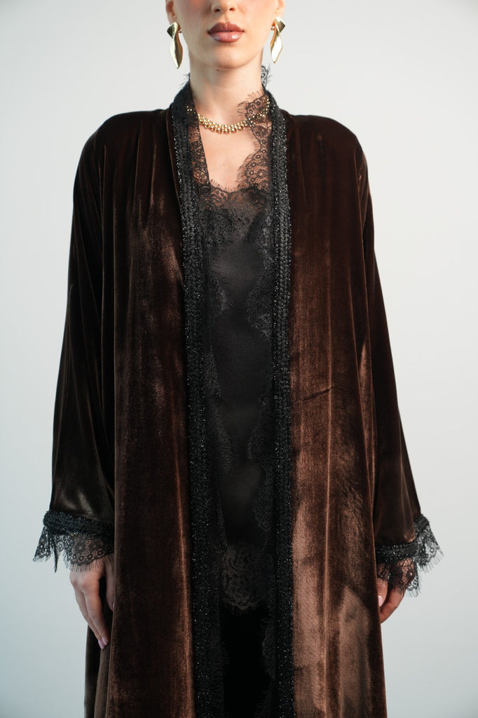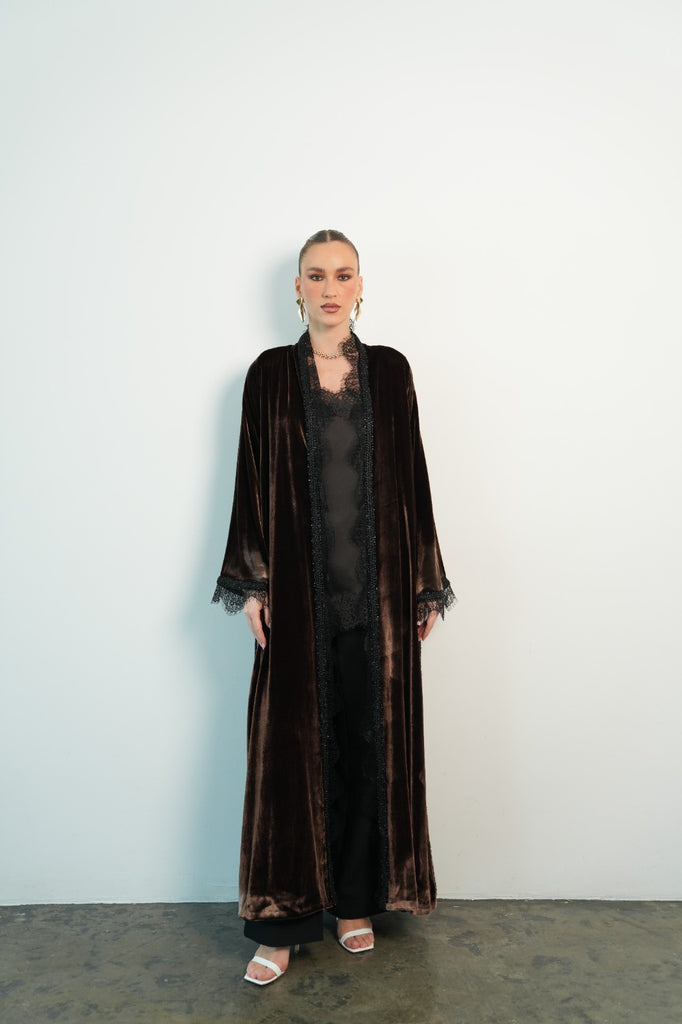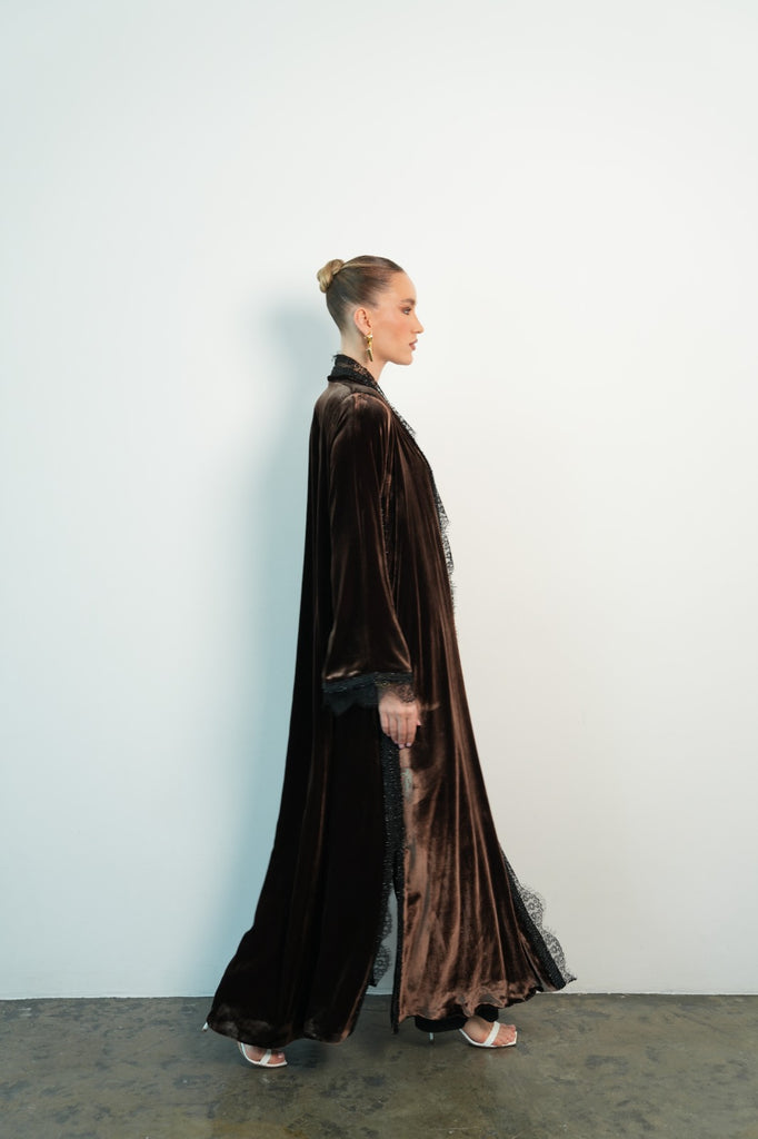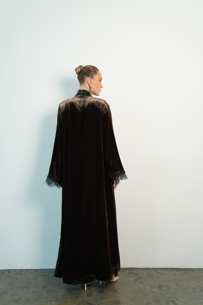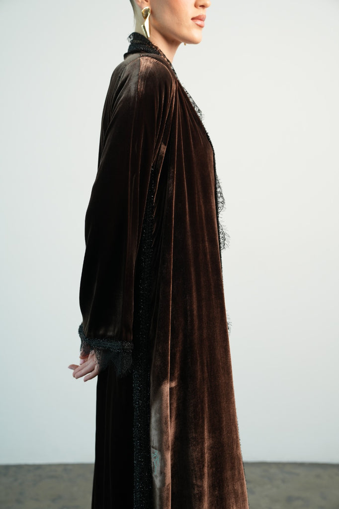 brown velvet abaya, with dentail on sides, front and sleeves.