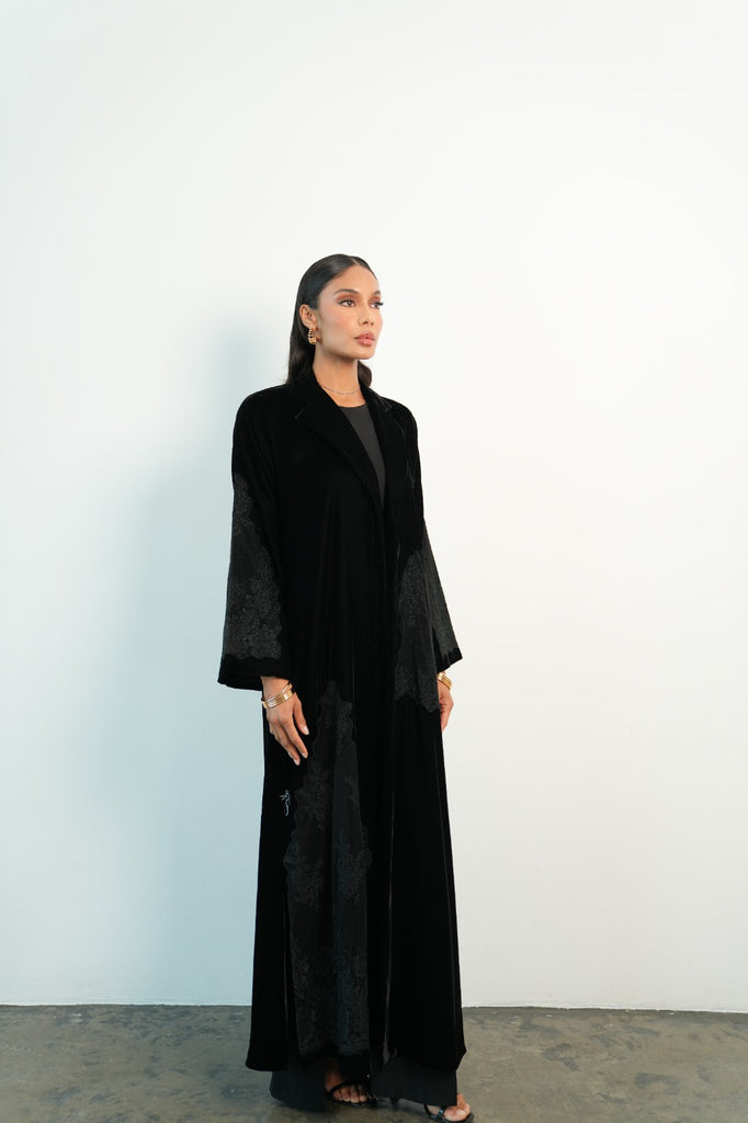 black velvet abaya, with dentail on sleeves and front