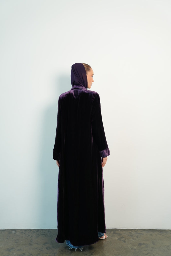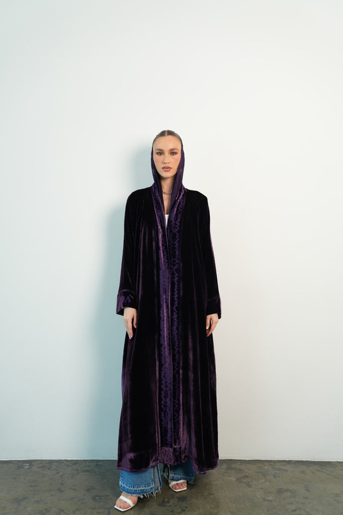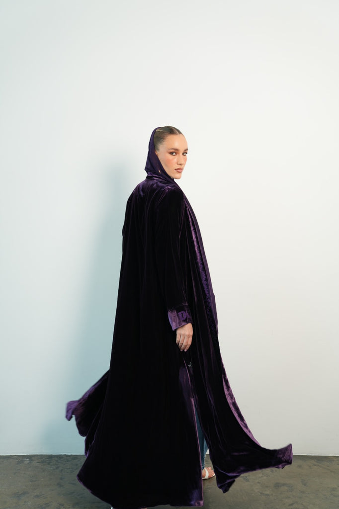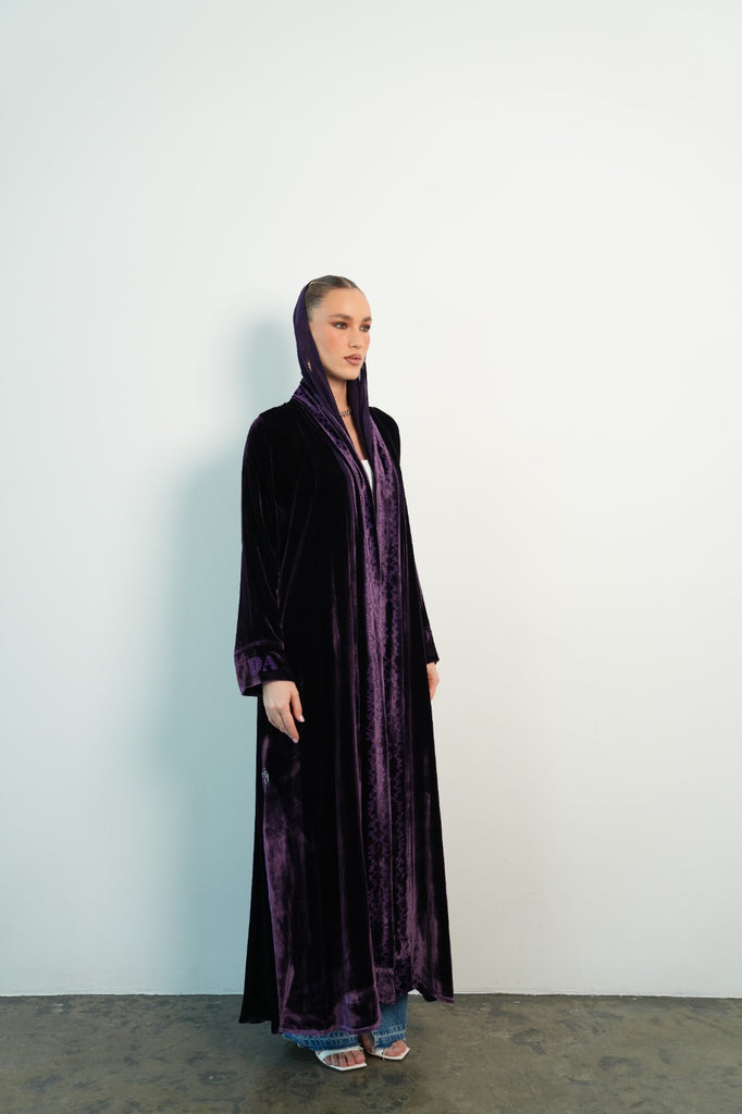 purple velvet abaya, with embroidery in front. Initials on the sleeve.