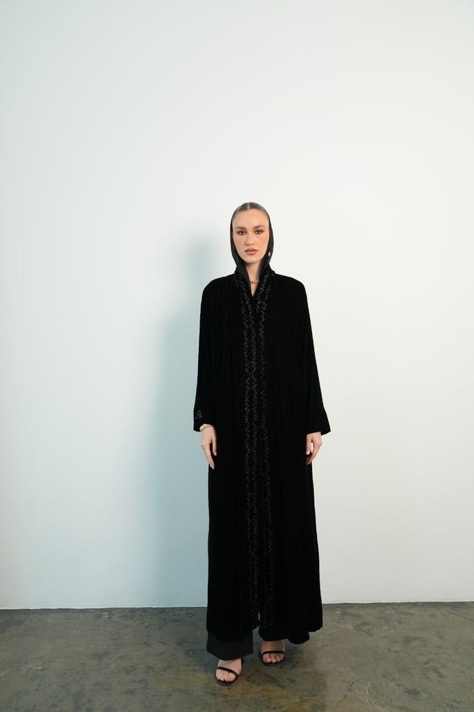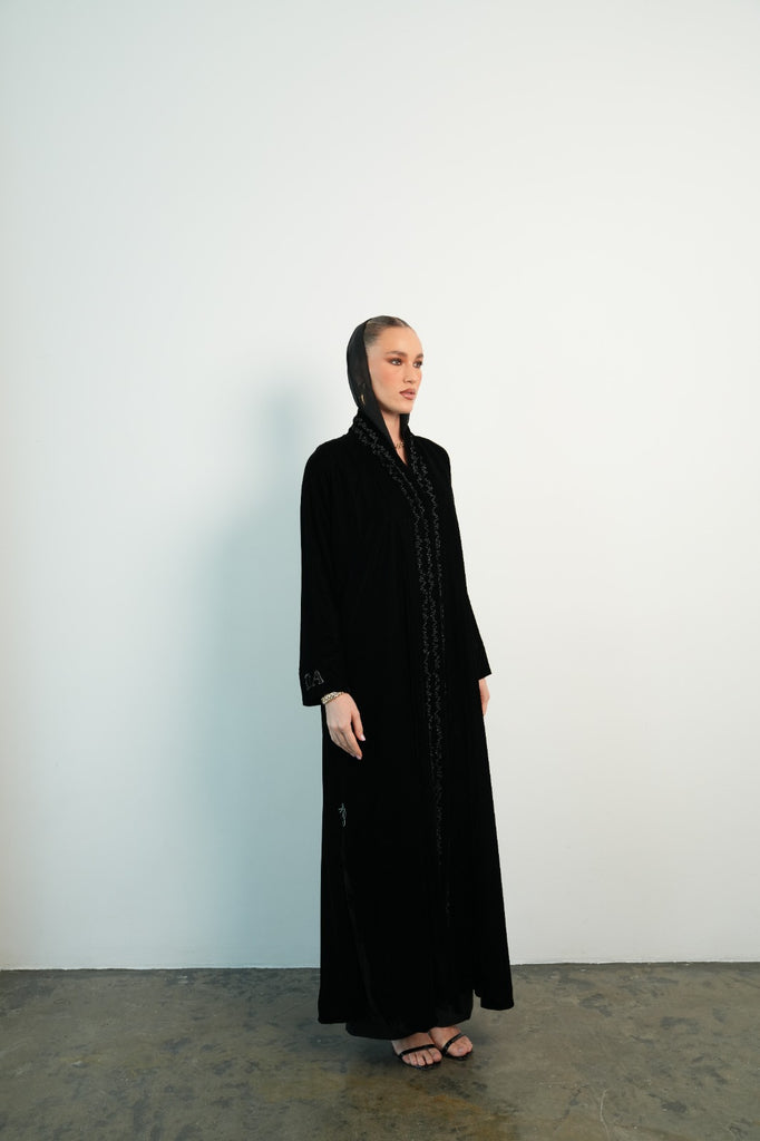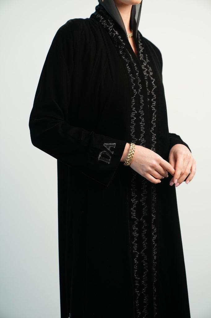 black velvet abaya, with embroidery in front. Initials on the sleeve.